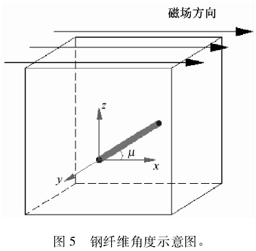 定向钢纤维混凝土制备中,钢纤维的设计方向为图 5 中的 x 轴方向,根据 X-CT 重构分析得到的钢纤维坐标结果计算钢纤维与 x 轴方向的夹角 μ,角度 μ 越小,钢纤维越接近设计方向。