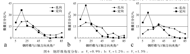 比例分别为 73% 、85% 、67% ,说明定向钢纤维混凝土中纤维的定向效果较好。