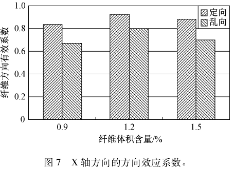 由图 7 可以看出,乱向钢纤维的方向效应系数要比理论值 0. 5 高,这是由于在混凝土的浇筑和振动过程中,对钢纤维起到了一定的定向效果。体积含量分别为 0. 9% 、1. 2% 、1. 5% 的钢纤维混凝土试件经定向后的纤维方向效应系数在平行于 X 方向较乱向纤维方向效应系数分别增加了 24% 、15% 、25% 。