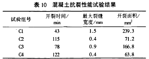 混凝土成型并停放2 h后重新抹面,然后风扇吹试件表面,风速为5—n/s,加速混凝土开裂,成型后24h观察裂缝数量、长度和宽度。由表10可知,纤维素纤维对混凝土抗裂性影响明显:①使第1条裂缝的出现时间推迟。C2组和C4组分别较基准组C1推迟72min,79min。②使最大裂缝宽度降低,C2组和C4组的最大裂缝宽度较C1组均降低73%。