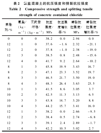 采用不同掺量的膨胀剂和玄武岩纤维来研究含氯盐混凝土的抗压强度与劈裂抗拉强度,近似模拟氯盐环境下立方体混凝土的力学性能。 在标准养护28 d 后,含氯盐混凝土抗压强度、抗压强度增长率、劈裂抗拉强度和劈裂抗拉强度增长率的试验结果见表 2。